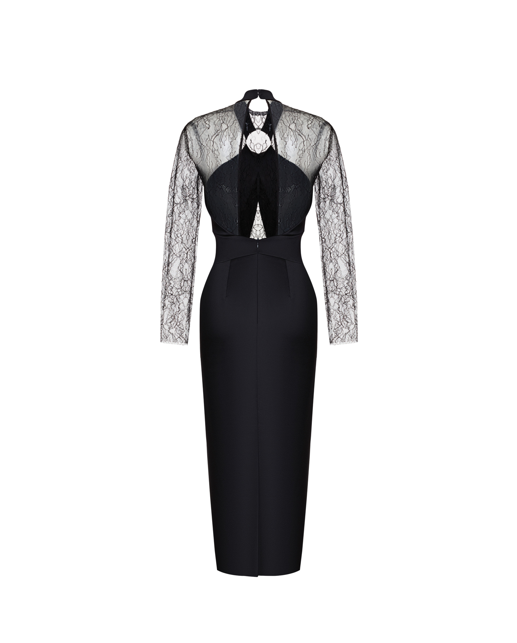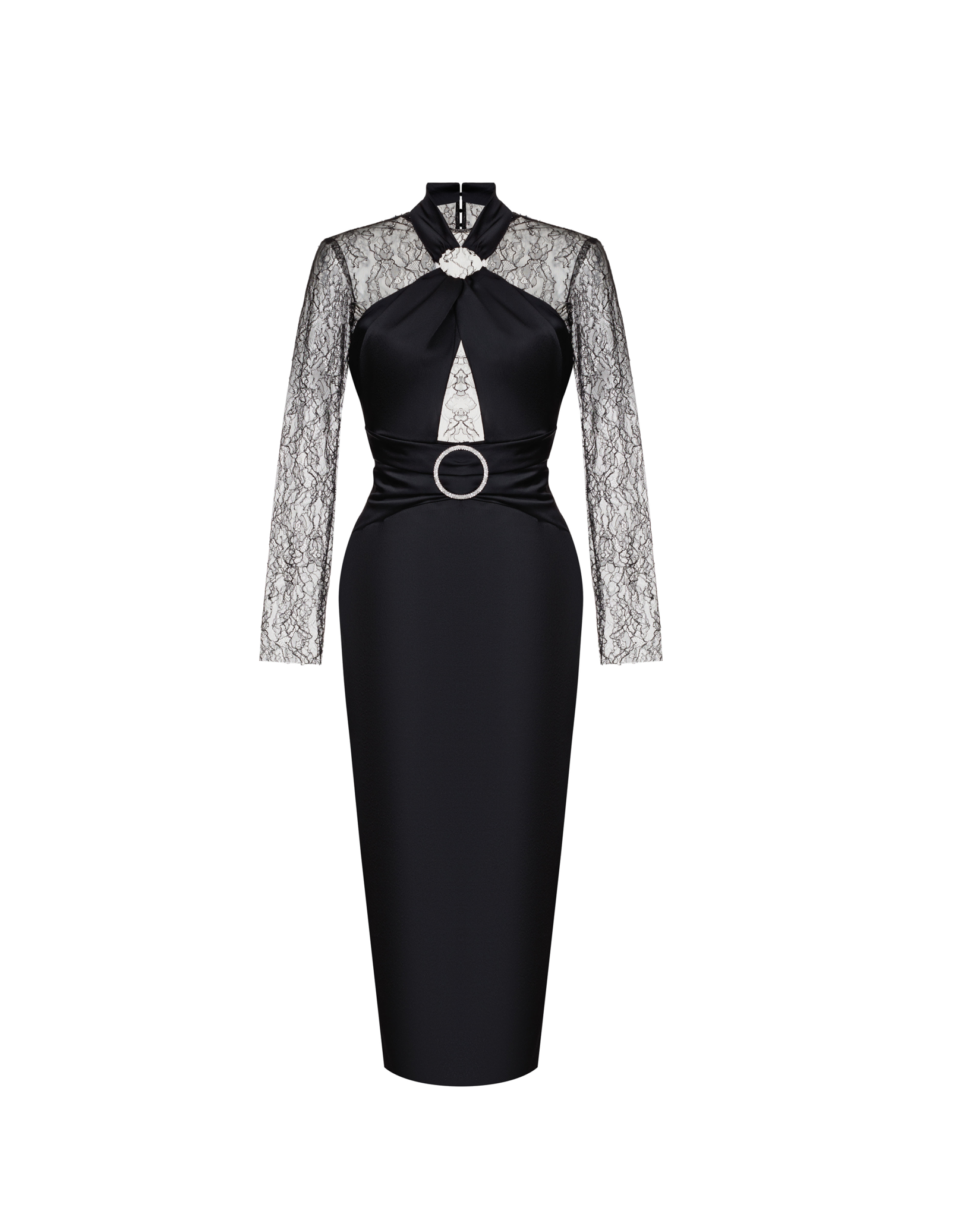 - Платье миди из сатина и кружева драпированное с кольцом и пряжкой
