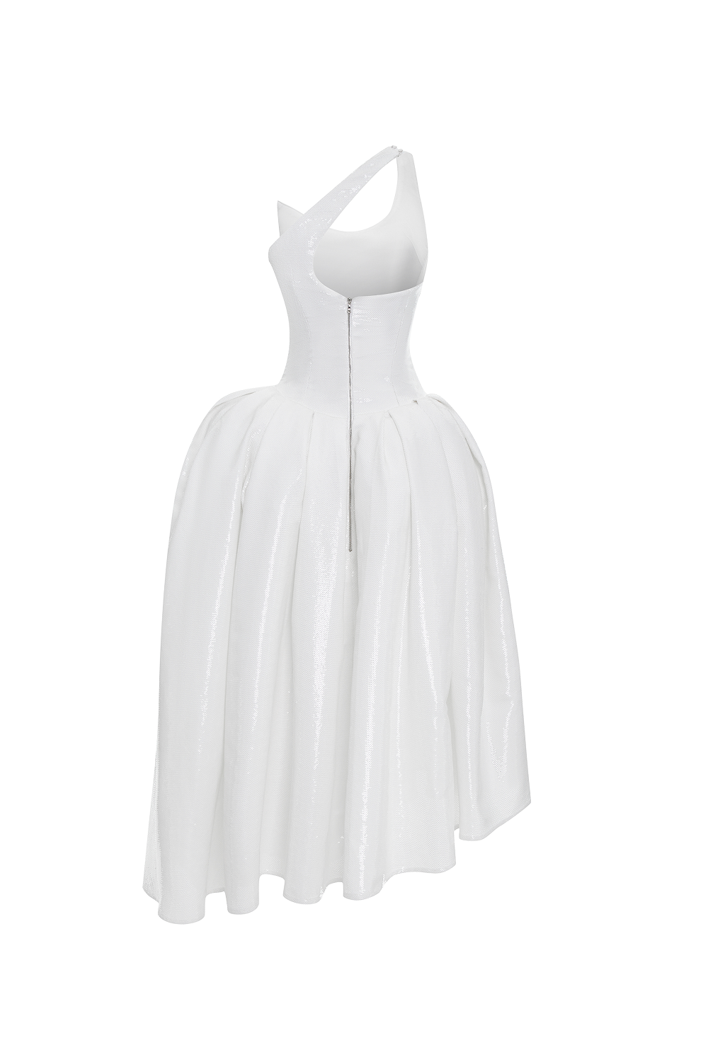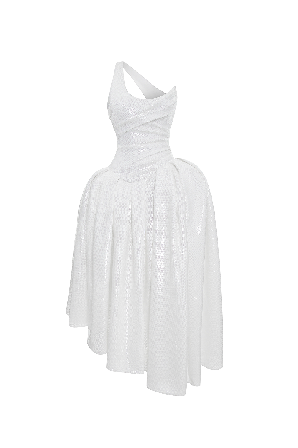 Платье макси с корсетным лифом, украшенным пайетками, и асимметричной бретелью на одно плечо. Лиф изделия очерчивает талию, а объем на бедрах формируется за счет фижмы и поролоновых накладок. Юбка оформлена элегантными складками от бедер и завершается асимметричным подолом.