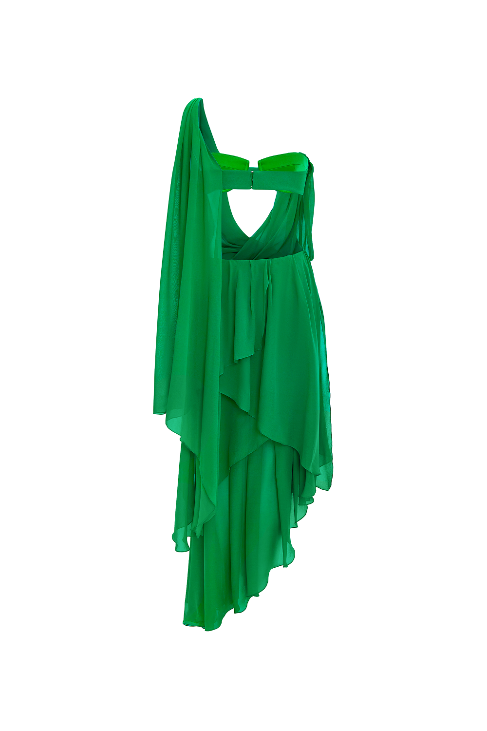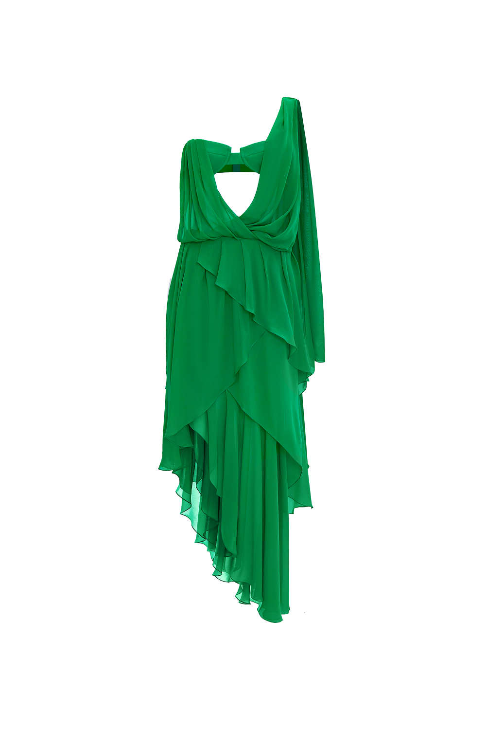 Платье макси из шифона с лифом-бюстье c чашечками и диагональной драпировкой спереди.Шифоновая драпировка спускается с одного плеча и чашечки, формируя деликатный просвет по центру. Юбка из перекрывающихся ярусных слоев заканчивается асимметричным подолом. Спина изделия открыта и оформлена элегантной шифоновой лентой, создавая легкий и романтичный образ.