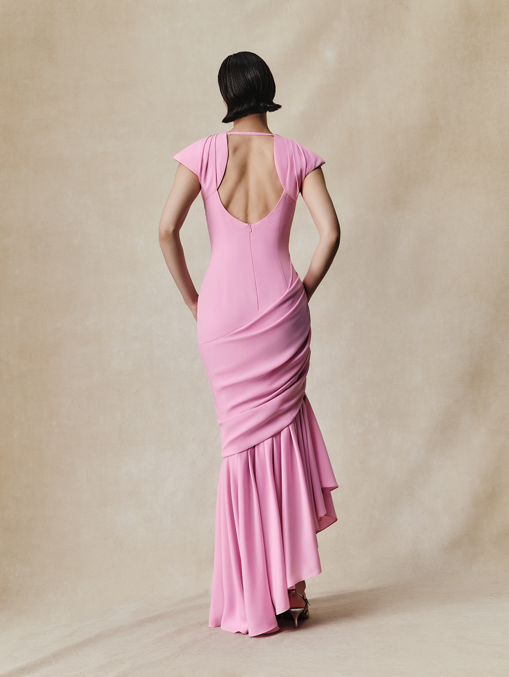 Платье макси из вискозного крепа с мягким округлым декольте и короткими рукавами с легким объемом у плеча. Драпировка проходит по диагонали лифа и мягко сходится к бедру. Спина приоткрыта овальным вырезом, а линия подола идет по диагонали и завершена мягким воланом, создающим асимметрию.