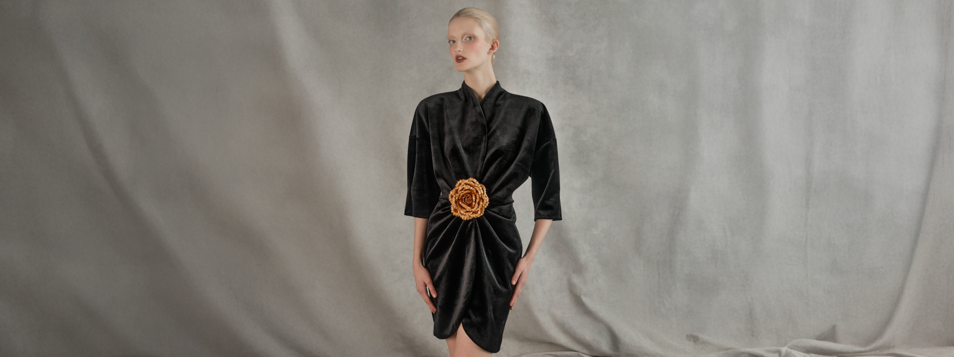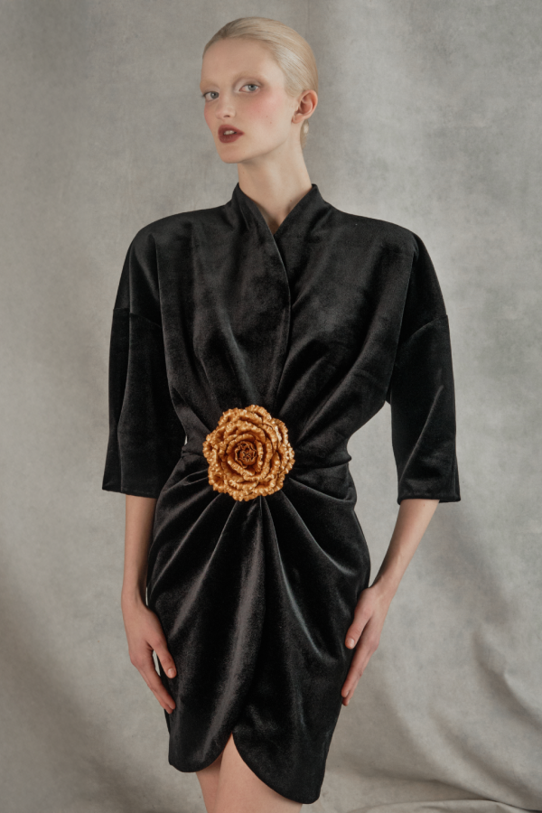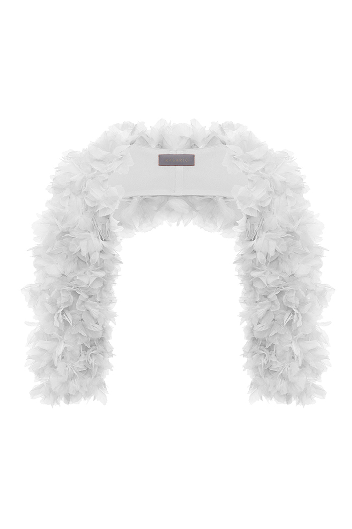 Это укороченное болеро украшено пышной цветочной отделкой, создавая эффектный и запоминающийся образ. Изделие прекрасно сочетается с платьем макси из атласа из новой коллекции.
