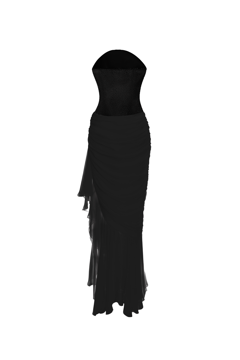 Корсетный лиф без бретелей, расшитый кристаллами, подчеркивает линию плеч и декольте. Юбка из шелкового шифона драпирована по боковой линии изделия: диагональная сборка формирует мягкие сборки и каскад, а многослойный подол из шифона создает изящное движение при ходьбе.