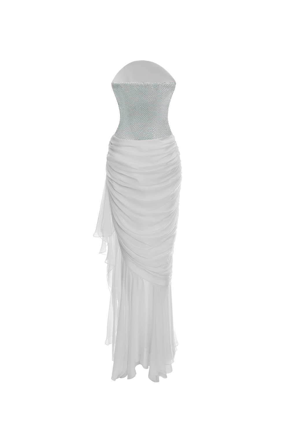 Корсетный лиф без бретелей, расшитый кристаллами, подчеркивает линию плеч и декольте. Юбка из шелкового шифона драпирована по боковой линии изделия: диагональная сборка формирует мягкие сборки и каскад, а многослойный подол из шифона создает изящное движение при ходьбе.