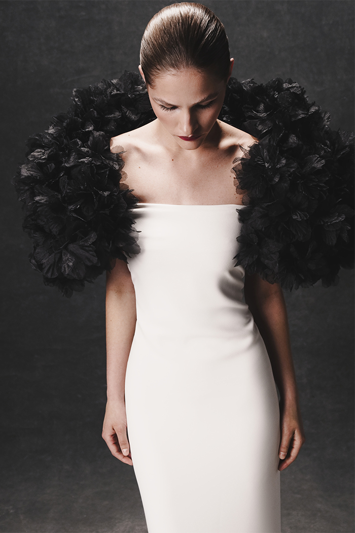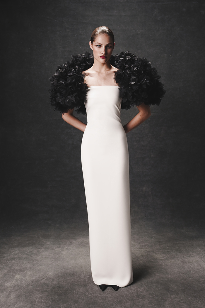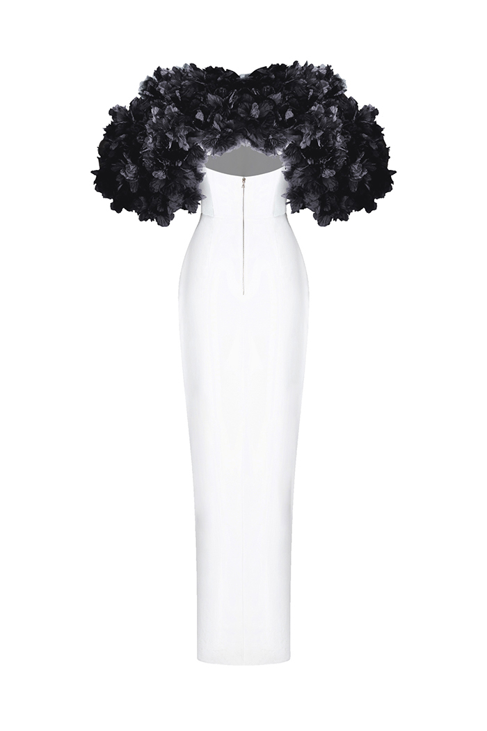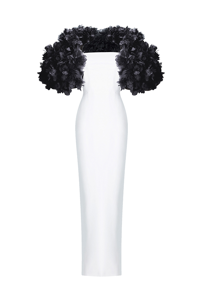 Элегантное платье, которое отличается строгим силуэтом с пышными цветочными элементами на плечах. Идеальный крой и посадка подчеркивают линию талии и бедер, завершаясь зауженным подолом.