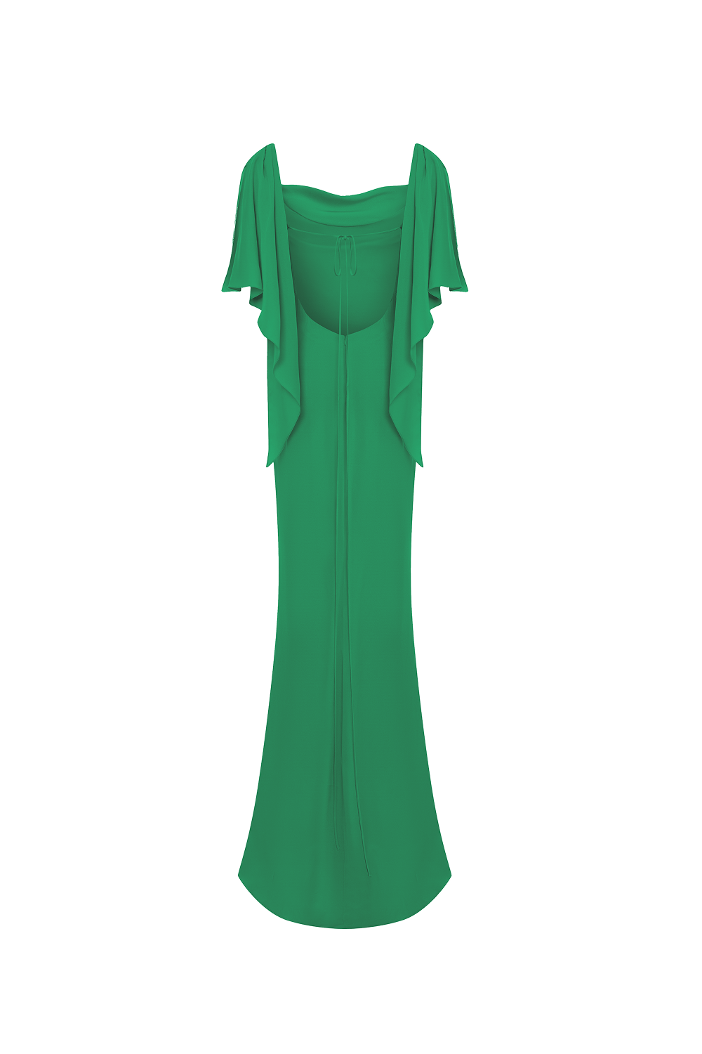 Платье макси из вискозного крепа с мягкой драпировкой по линии декольте. От плеч спадают удлиненные драпированные рукава, элегантно обрамляя руки. Легкая сборка на талии плавно ведет к гладкой юбке длины макси. Открытая спина оформлена тонкими завязками по линии лопаток.