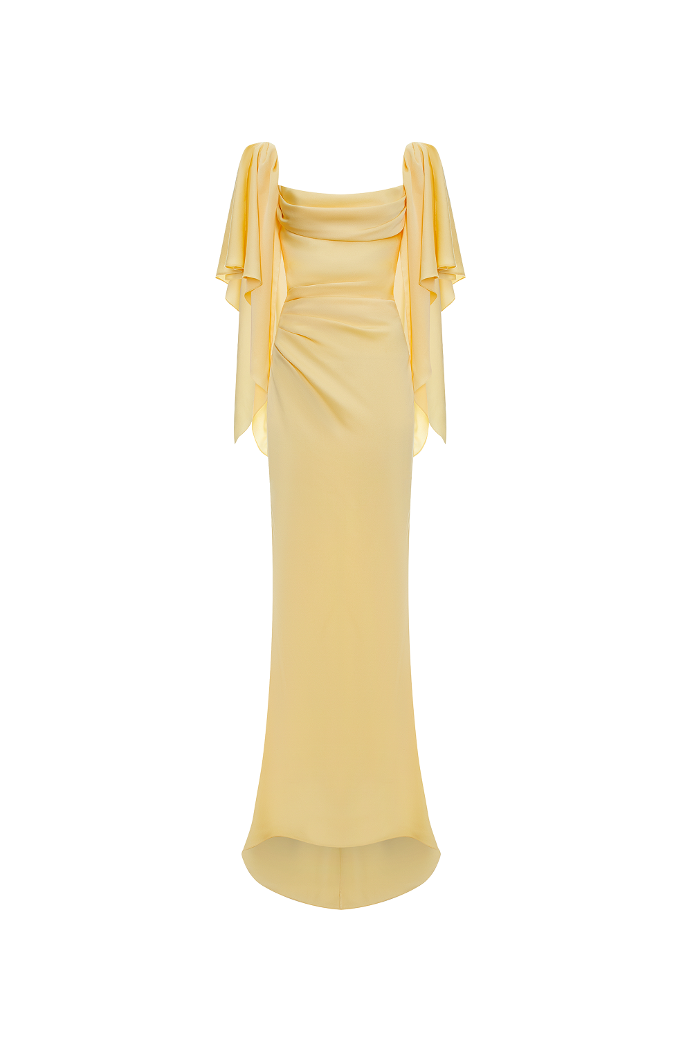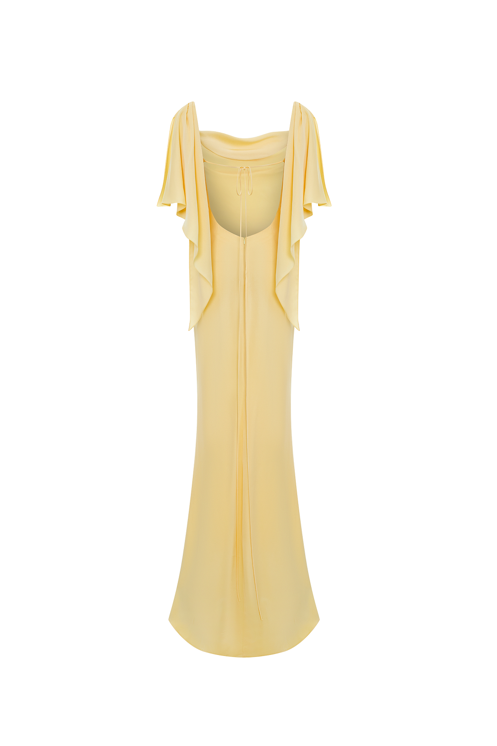 Платье макси из вискозного крепа с мягкой драпировкой по линии декольте. От плеч спадают удлиненные драпированные рукава, элегантно обрамляя руки. Легкая сборка на талии плавно ведет к гладкой юбке длины макси. Открытая спина оформлена тонкими завязками по линии лопаток.