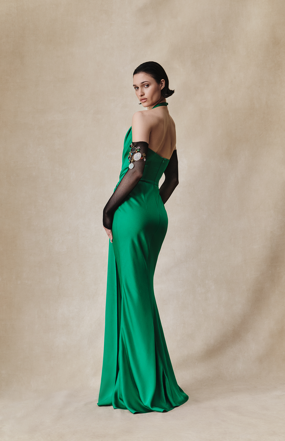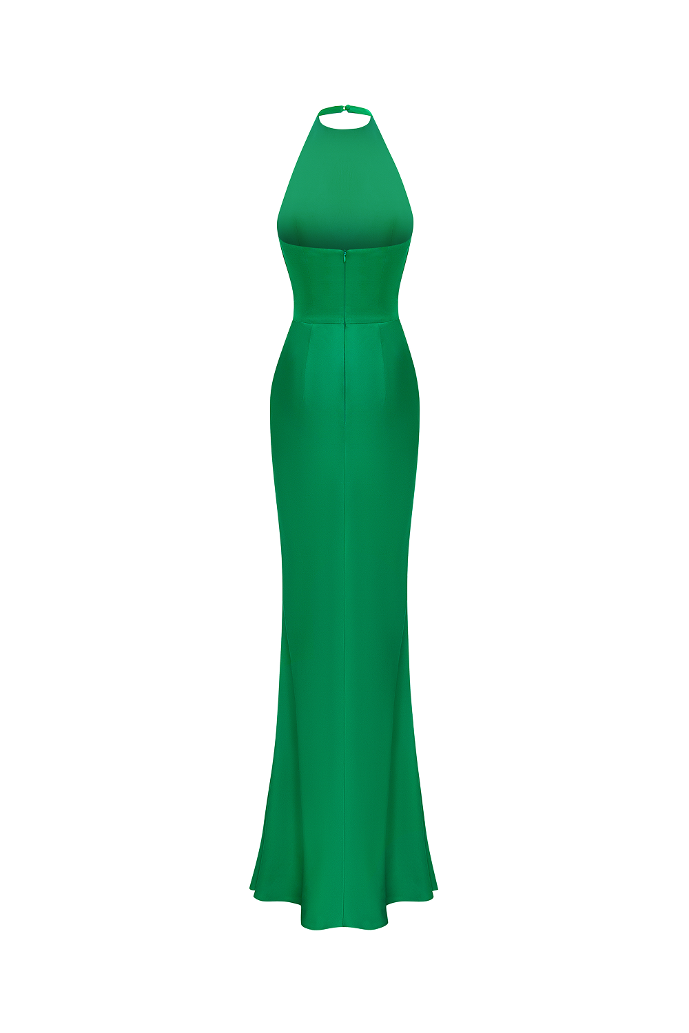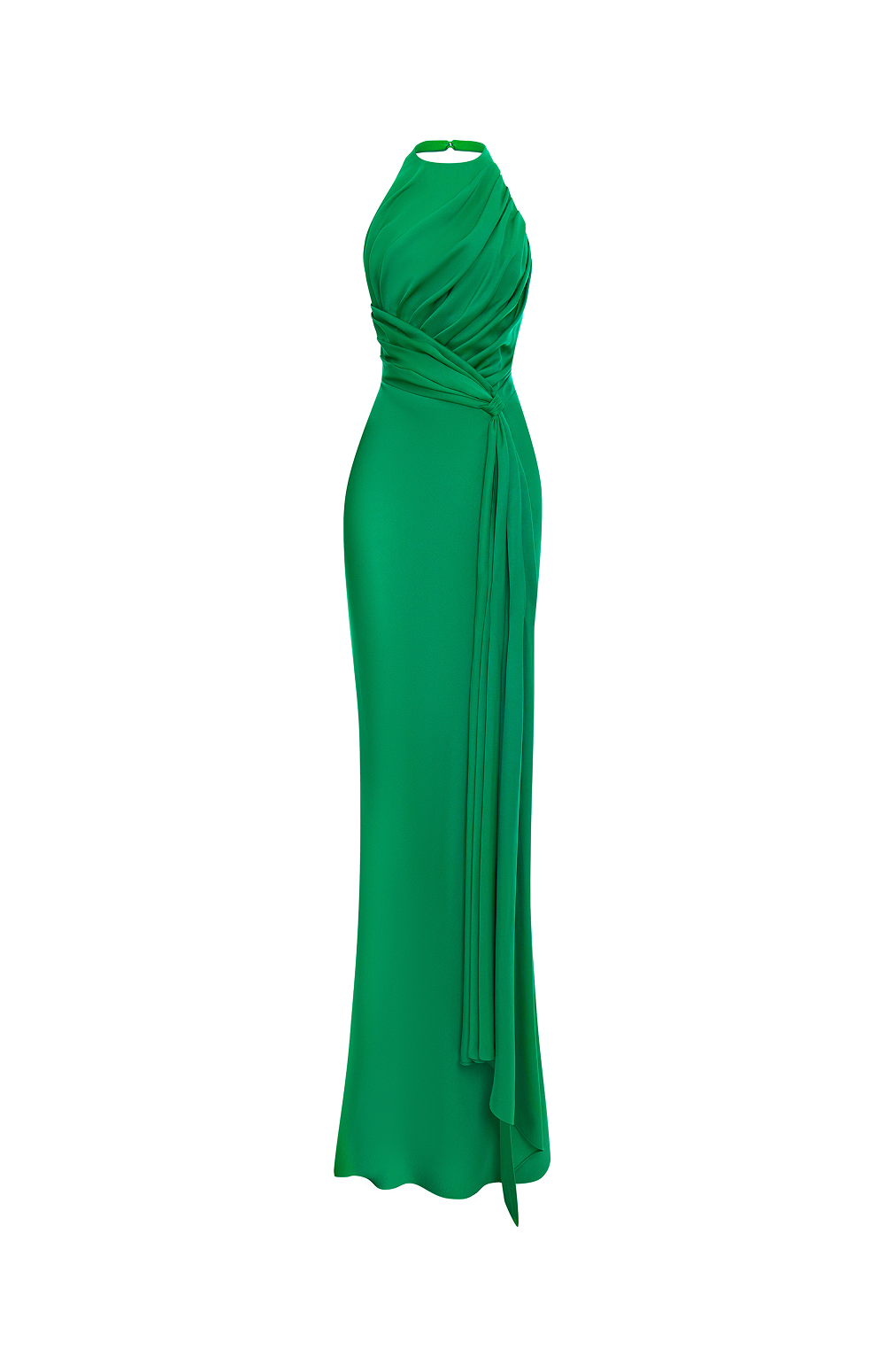 Платье макси из вискозного крепа с драпированным лифом и воротником-халтер. Плотная посадка в области талии подчеркнута драпировкой, переходящей в декоративный летящий шлейф. Облегающий крой в нижней части раскрывается в плавное расклешение.
