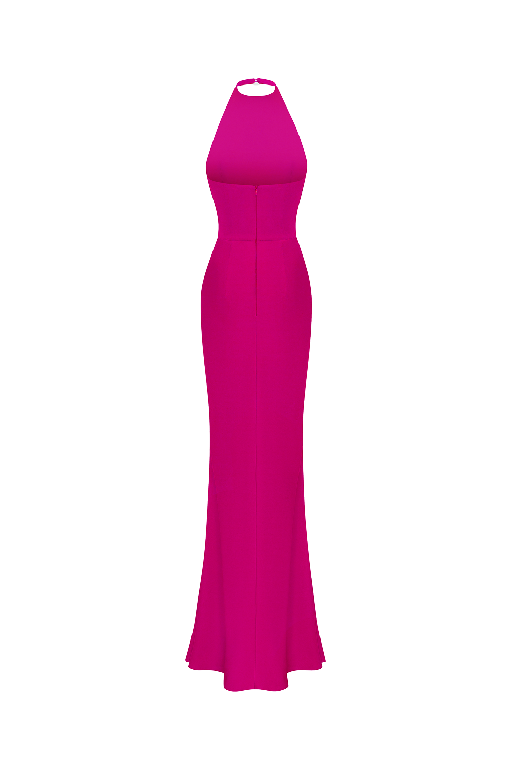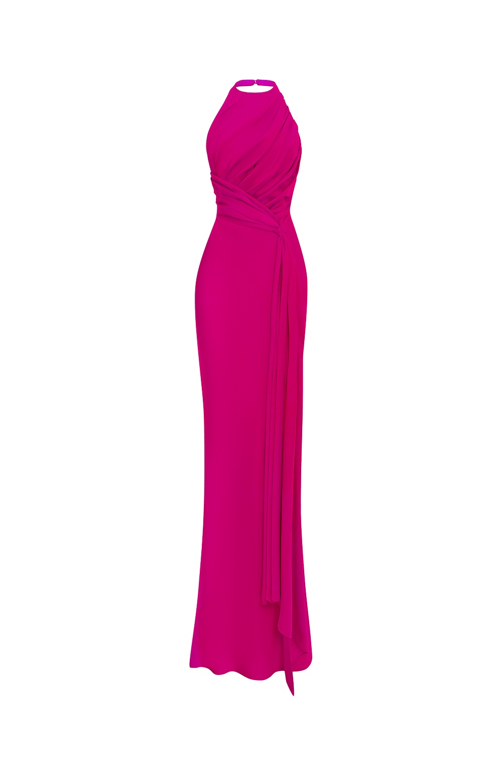 Платье макси из вискозного крепа с драпированным лифом и воротником-халтер. Плотная посадка в области талии подчеркнута драпировкой, переходящей в декоративный летящий шлейф. Облегающий крой в нижней части раскрывается в плавное расклешение.