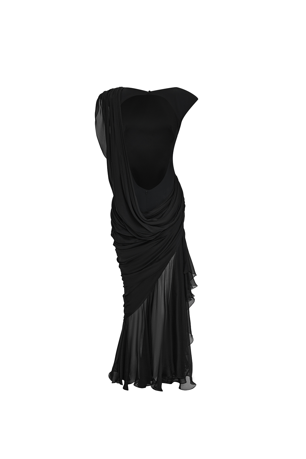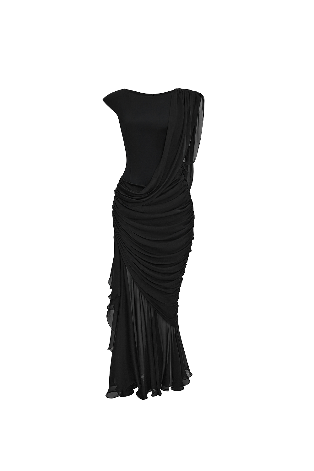 Платье макси из вискозы и шелка с диагональной драпировкой и подчеркнутыми плечами. Конструкция из мягкой драпировки ниспадает с левого плеча к талии и далее переходит в юбку. Спина изделия оформлена овальным вырезом, завершая элегантный образ.