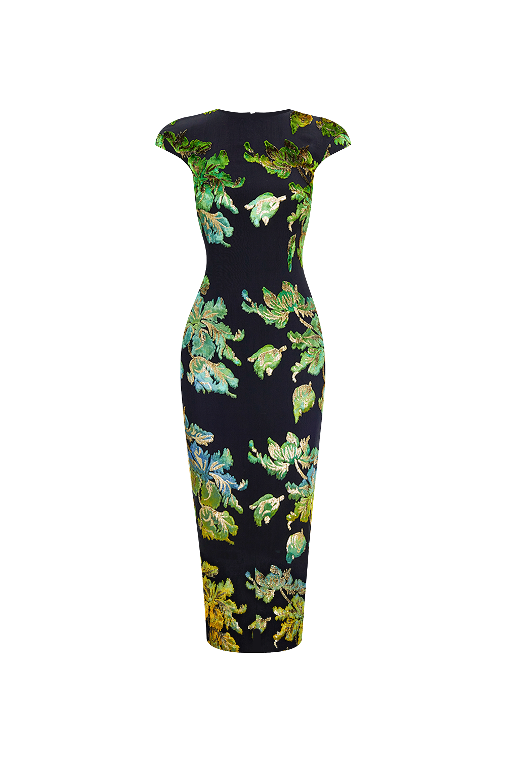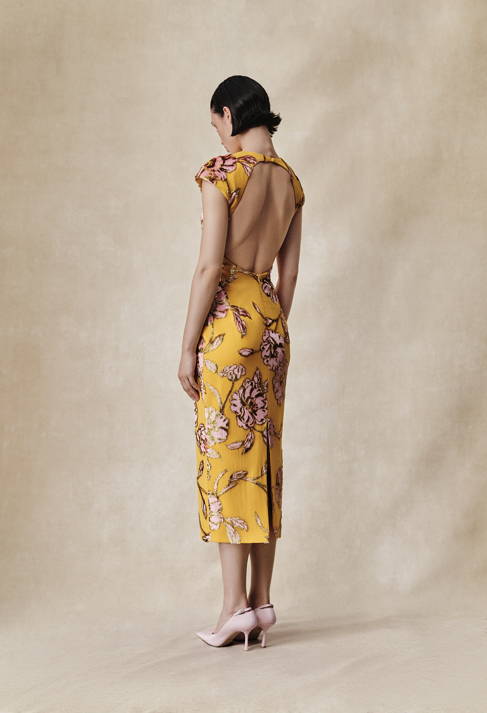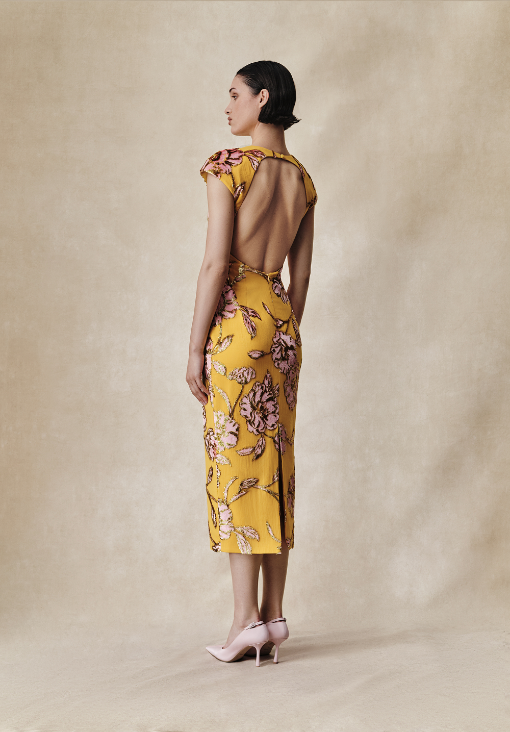 Платье миди из бархата деворе с цветочным узором. Линия плеч подчеркнута за счет небольшого объема. Фижмы на бедрах формируют дополнительный скульптурный объем. Овальный вырез на спине делает силуэт более женственным, а разрез сзади добавляет свободы движения, элегантно завершая образ.