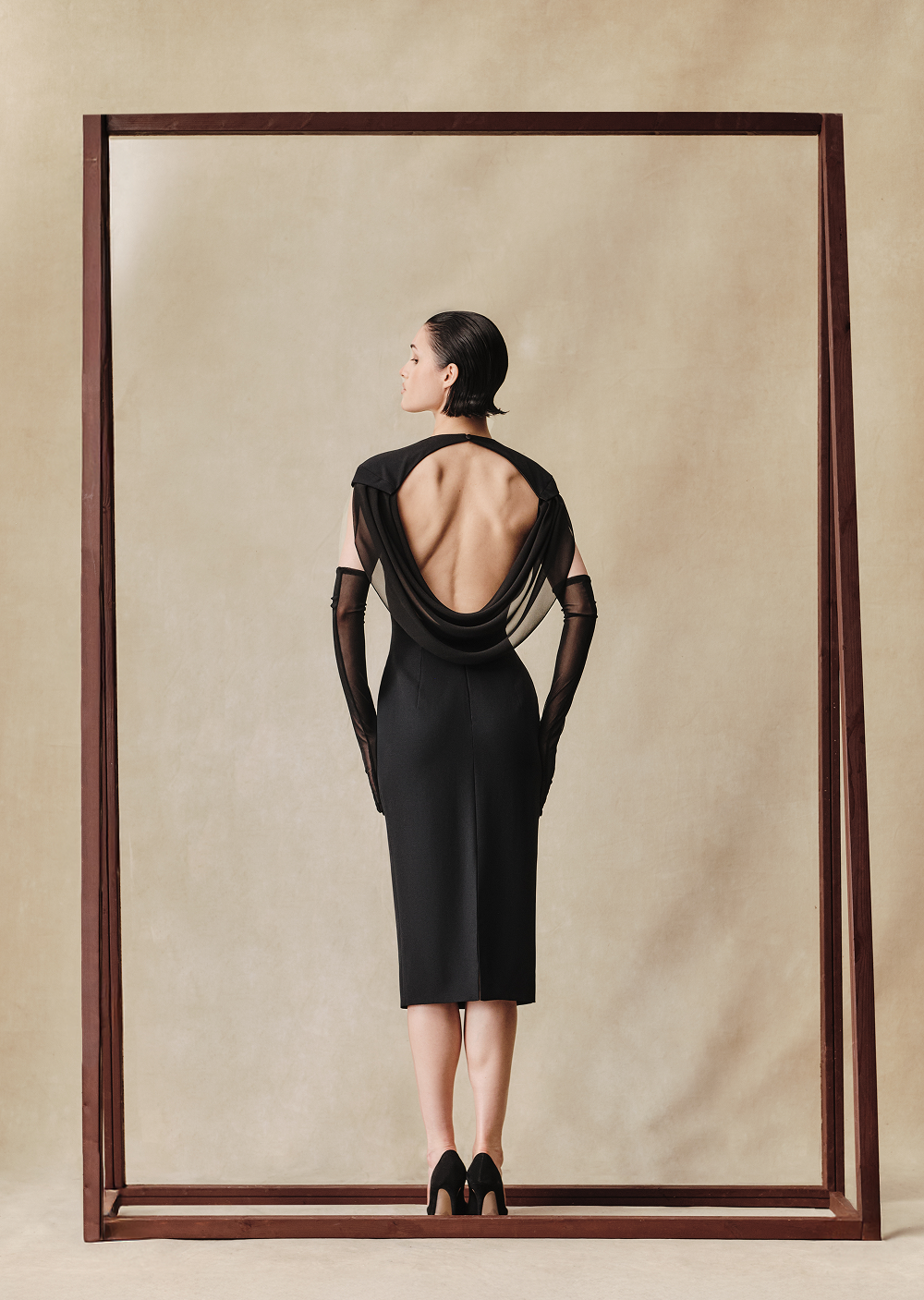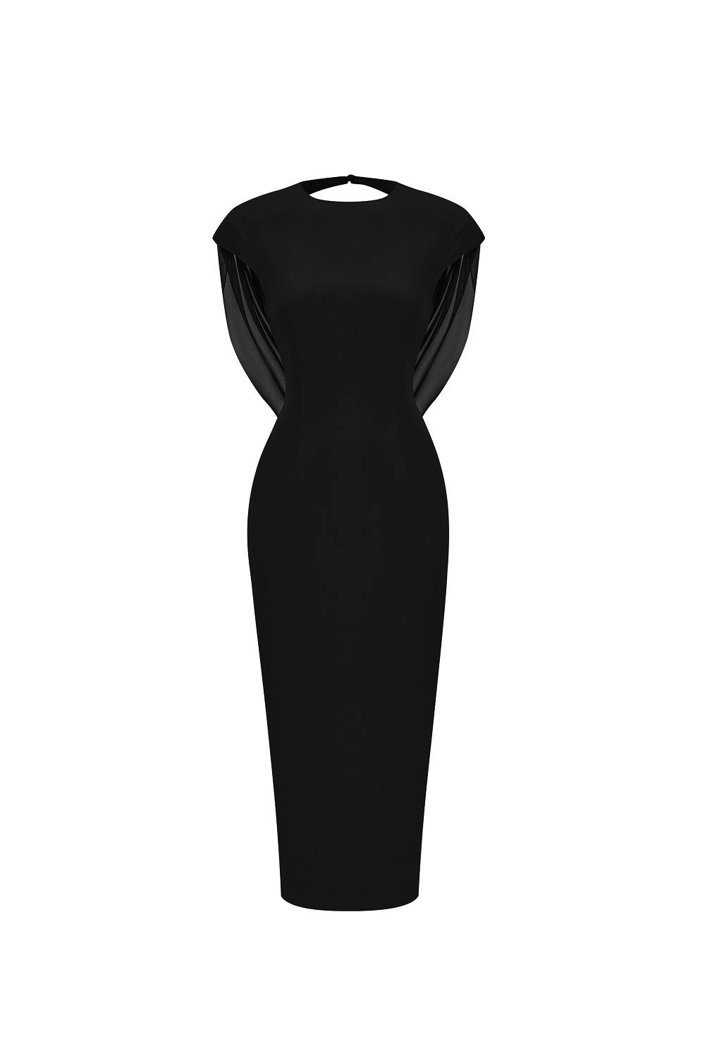 Платье миди из вискозы и шелка с закрытым круглым вырезом и слегка удлиненной линией плеч. Приталенный силуэт изделия подчеркивает фигуру. Элегантная навесная драпировка-качель на спине создает эффектный и утонченный образ.