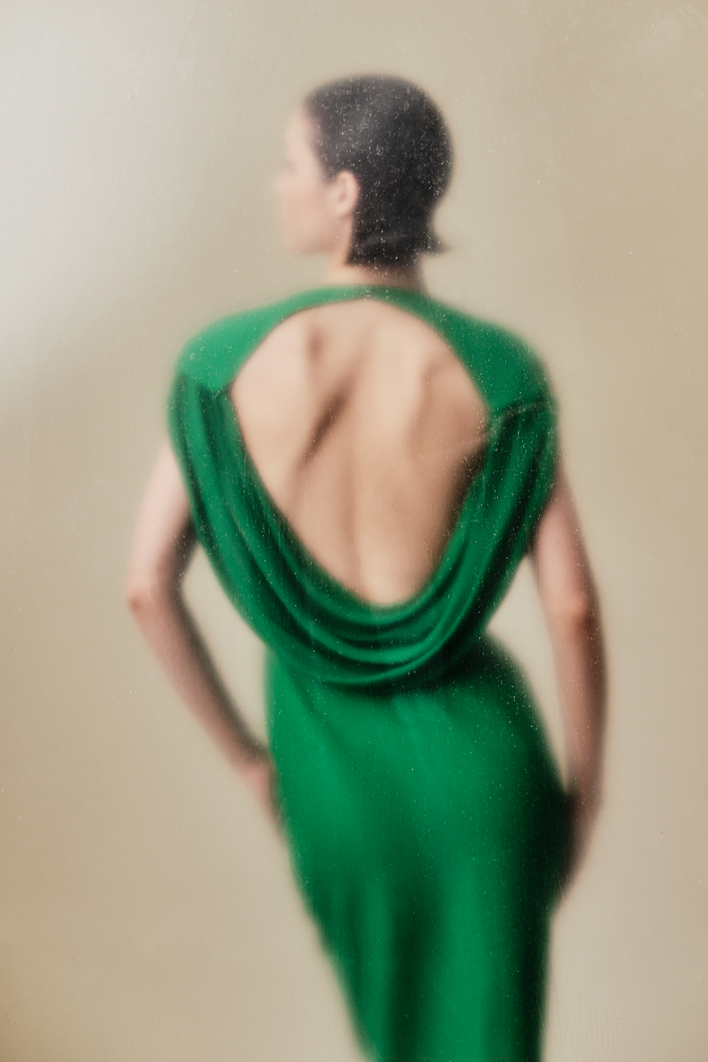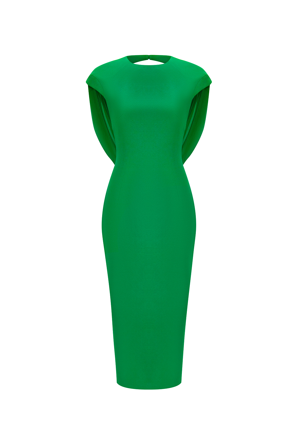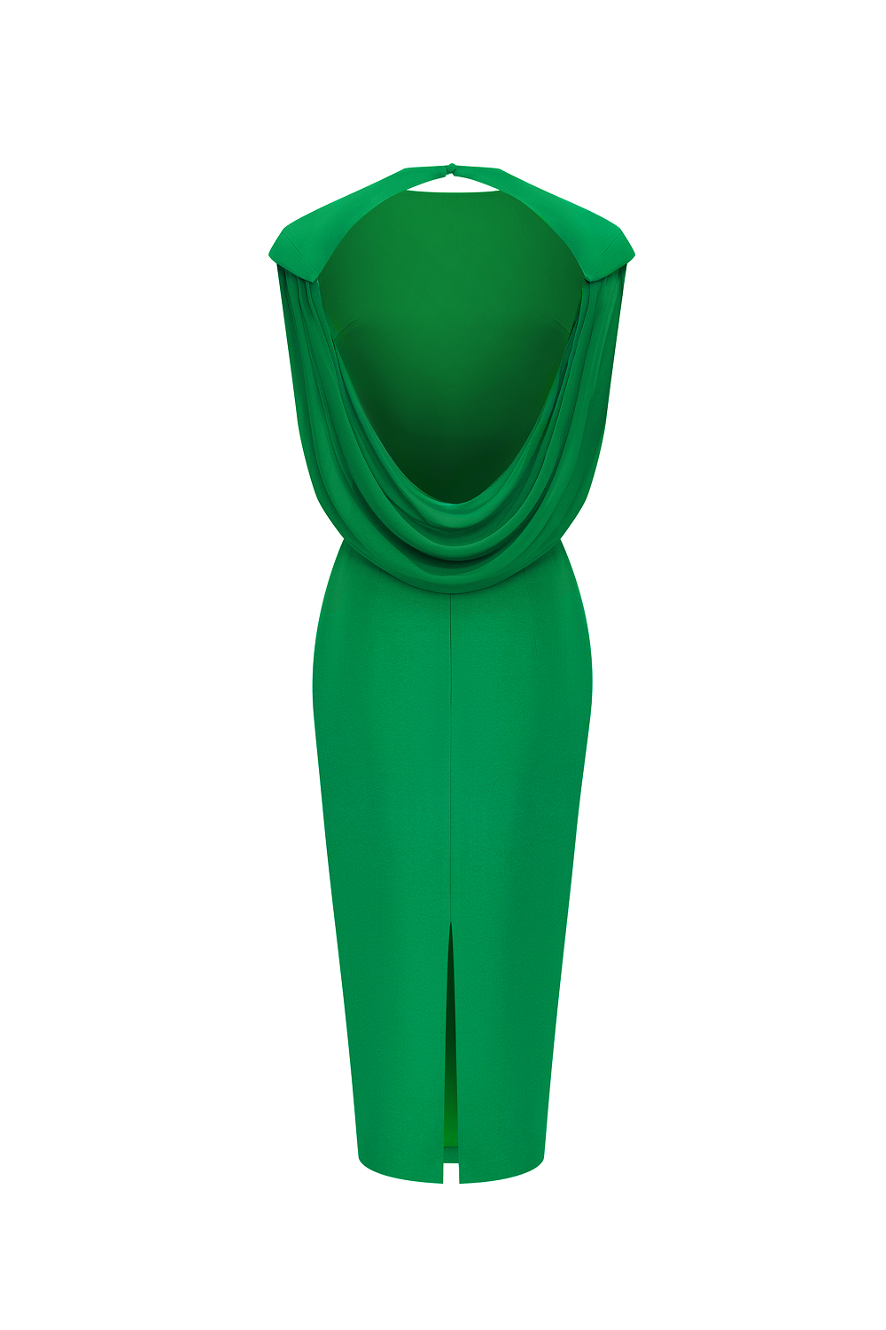 Платье миди из вискозы и шелка с закрытым круглым вырезом и слегка удлиненной линией плеч. Приталенный силуэт изделия подчеркивает фигуру. Элегантная навесная драпировка-качель на спине создает эффектный и утонченный образ.