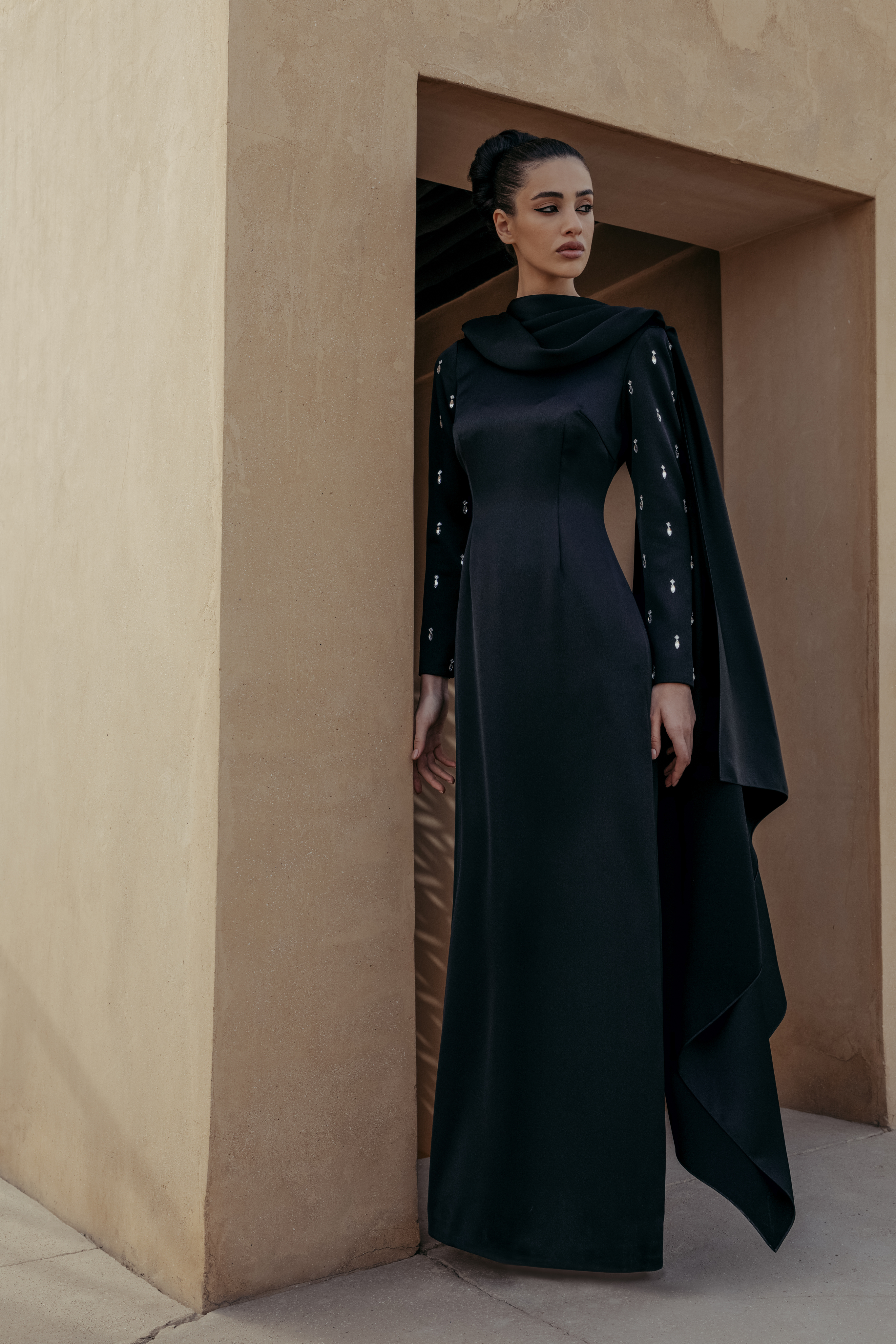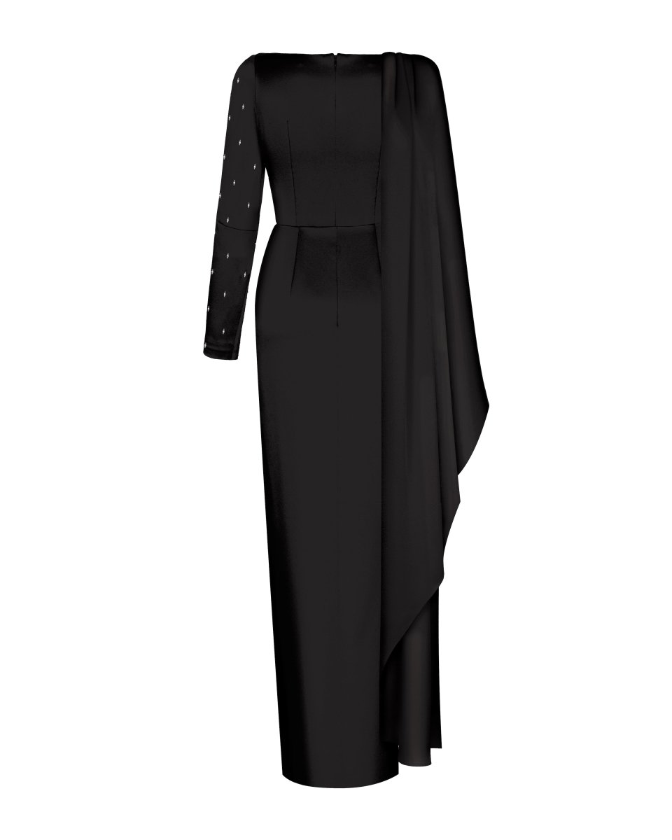 Платье макси сатиновое с драпированным воротником и вышивкой на рукавах