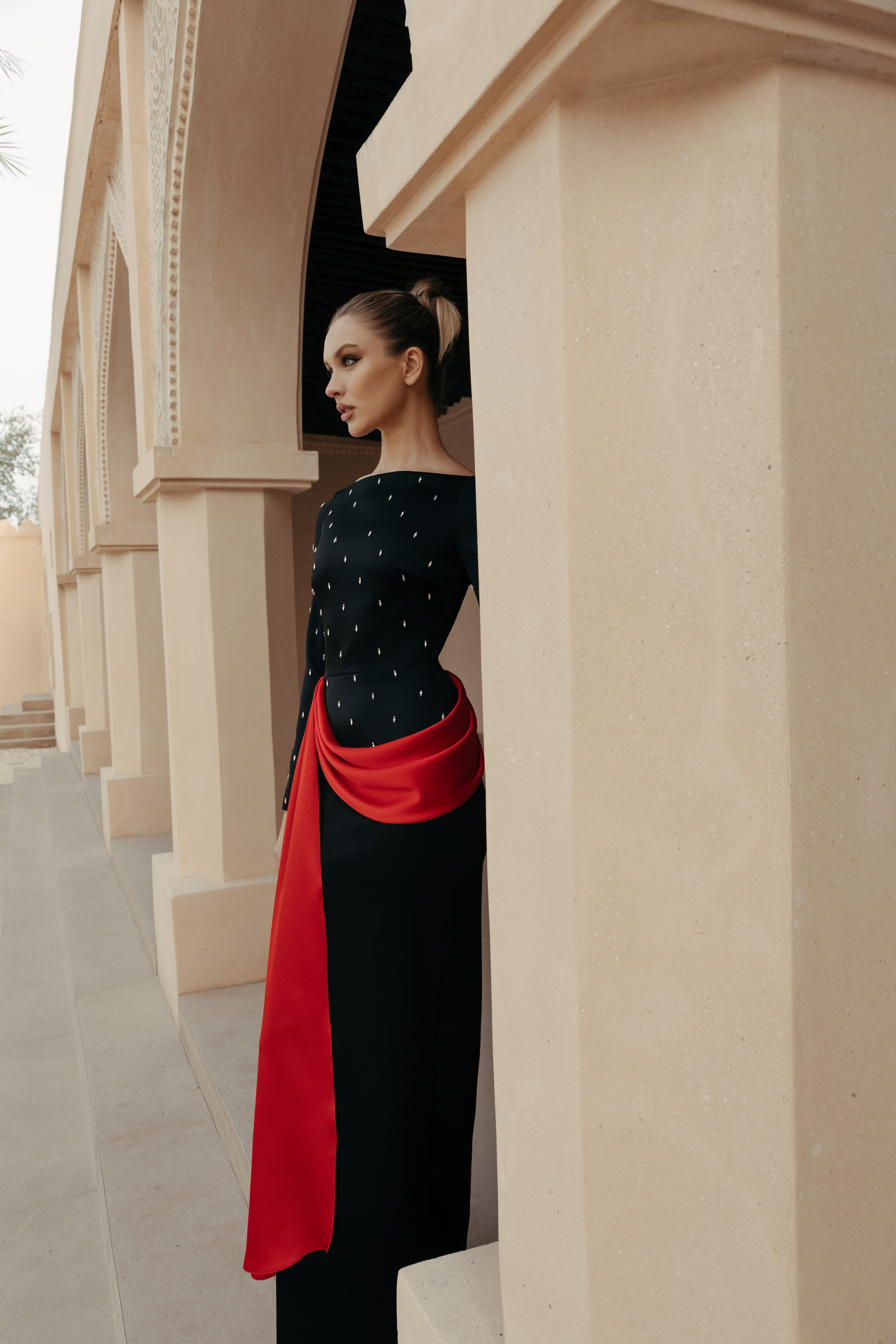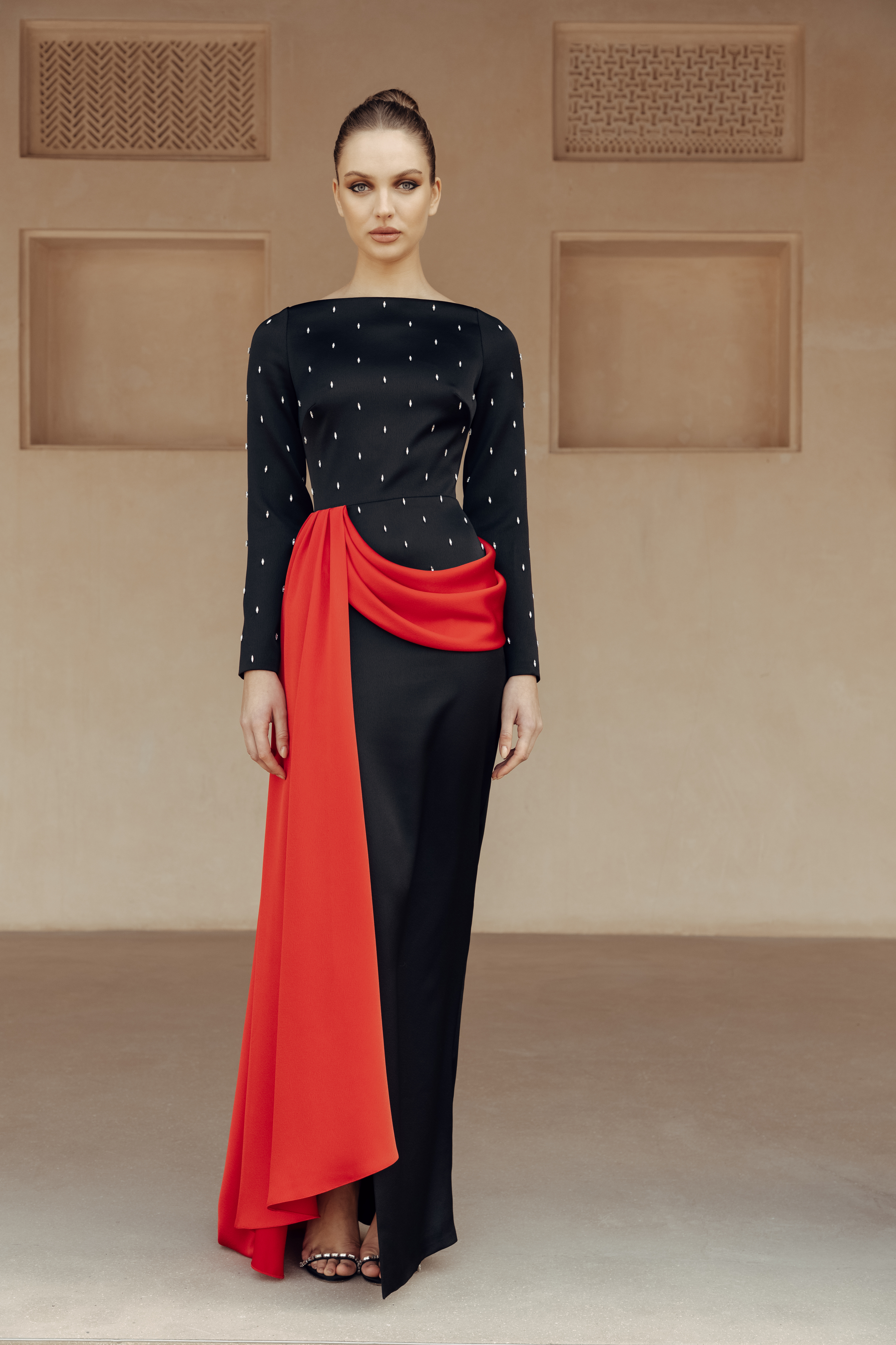 Платье макси сатиновое с вышивкой и драпированным поясом