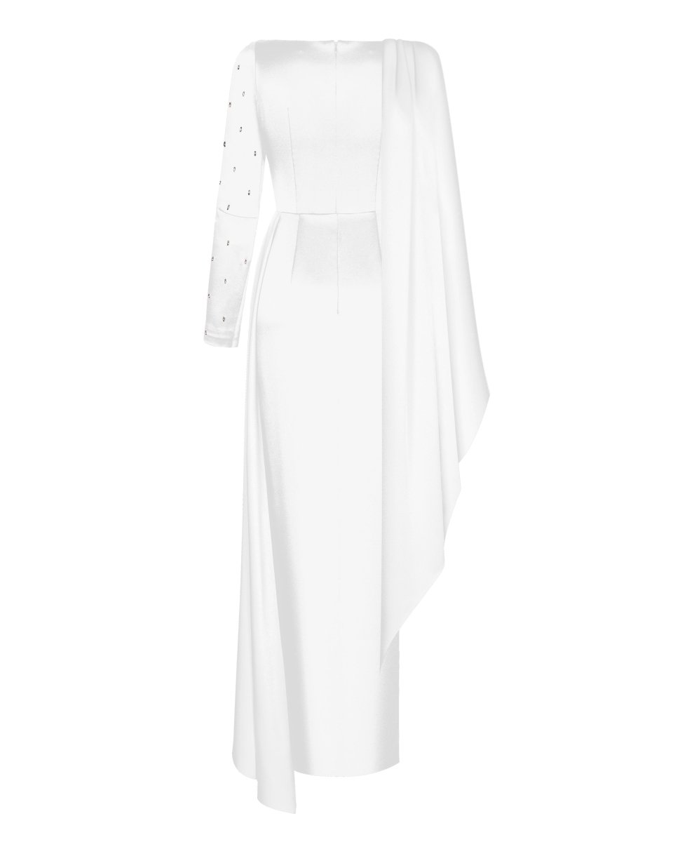 Платье макси сатиновое с асимметричной драпировкой и вышивкой