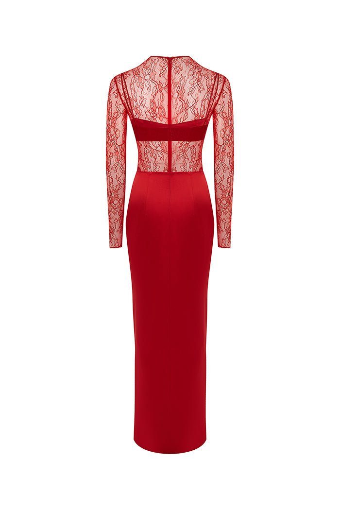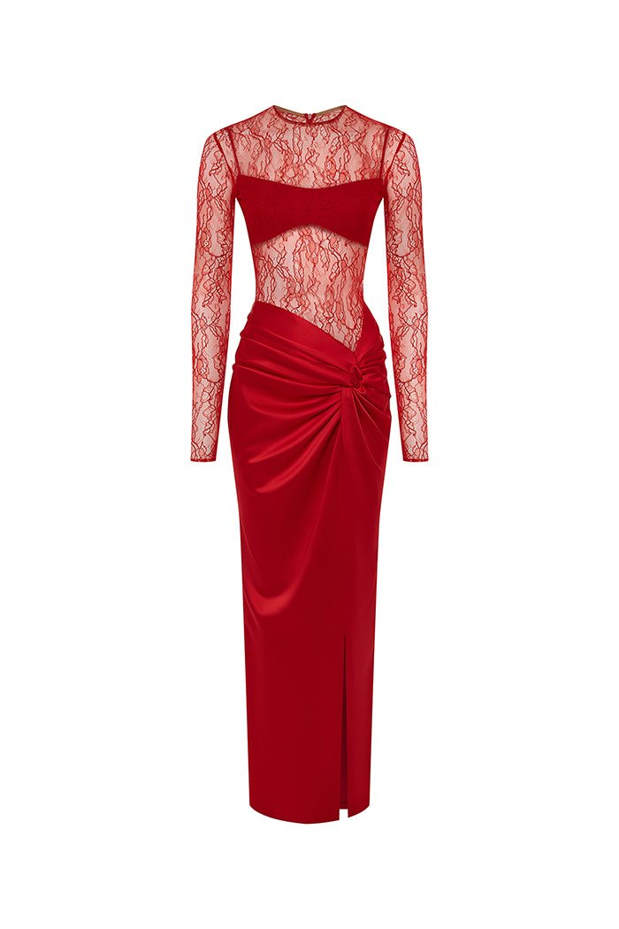 - Платье макси драпированное из атласа и кружева с закрытым лифом