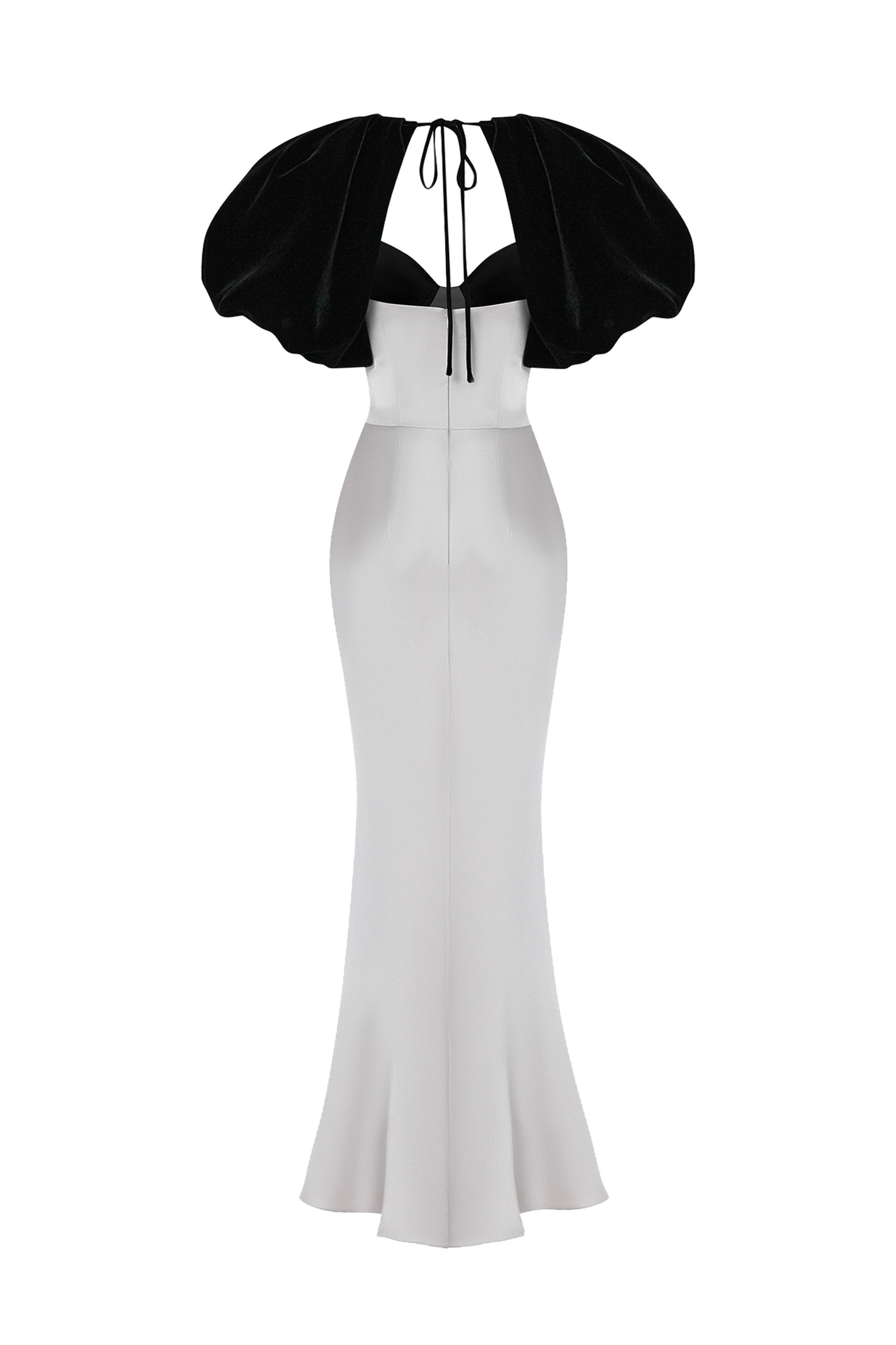 Платье макси из бархата и сатина с объемными рукавами и бахромой